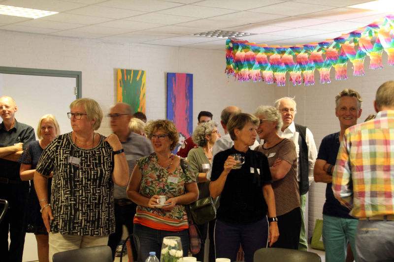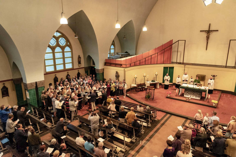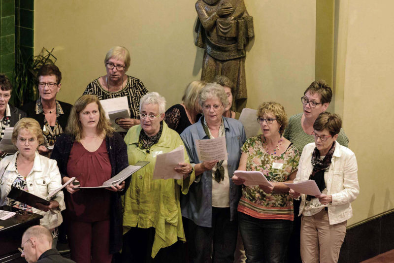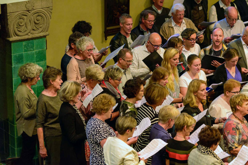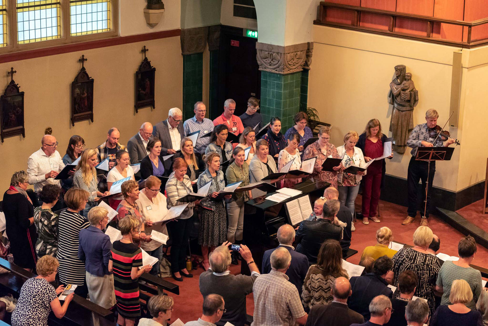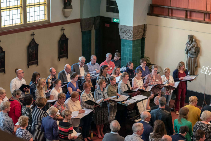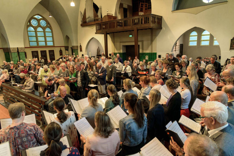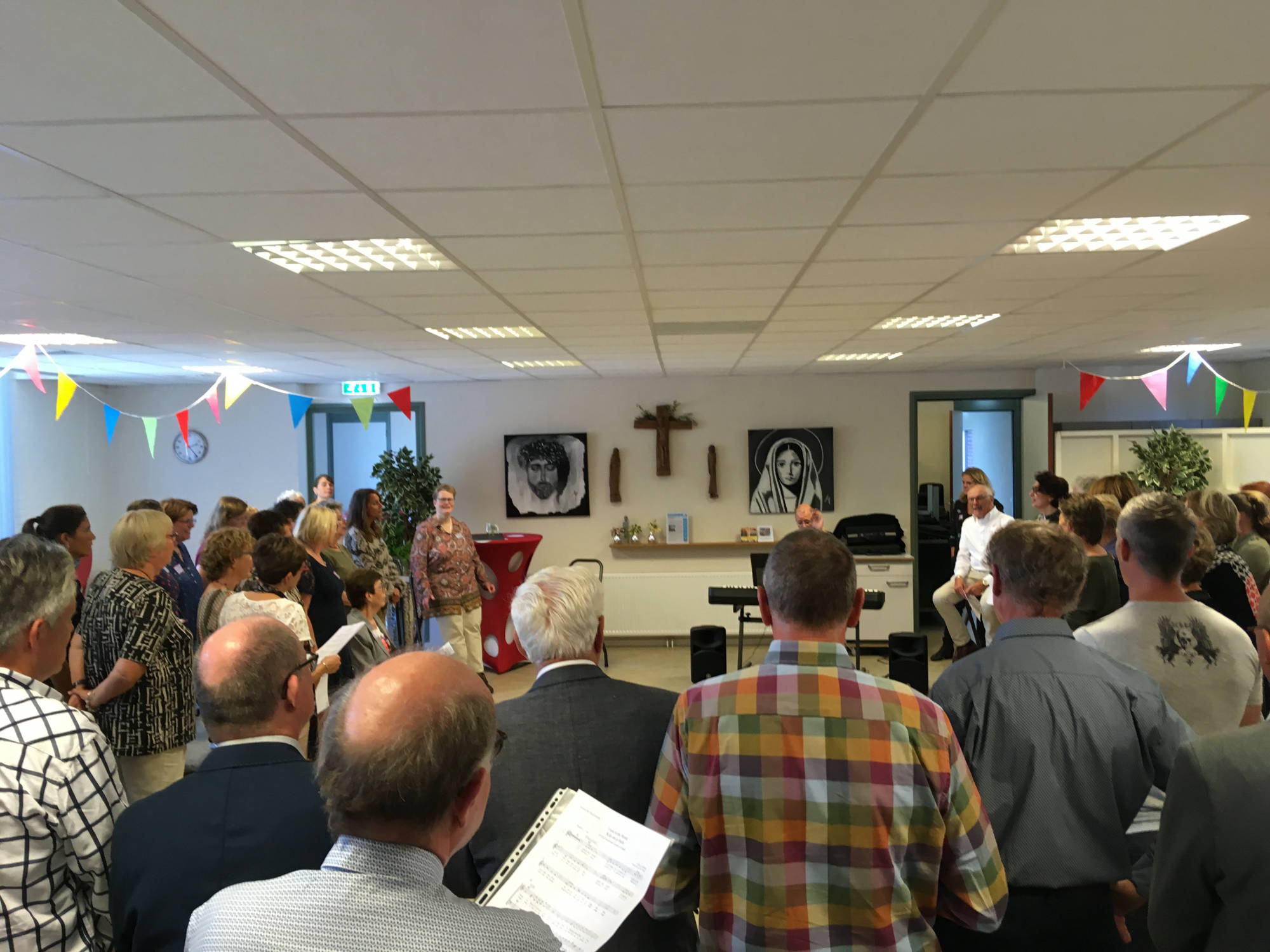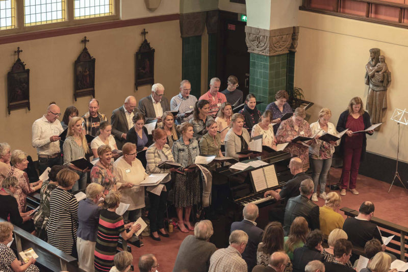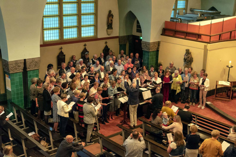 Voor het gezamelijke slotlied van alle aanwezige koorleden van de afgelopen 50 jaar moest wel even gerepeteerd worden.